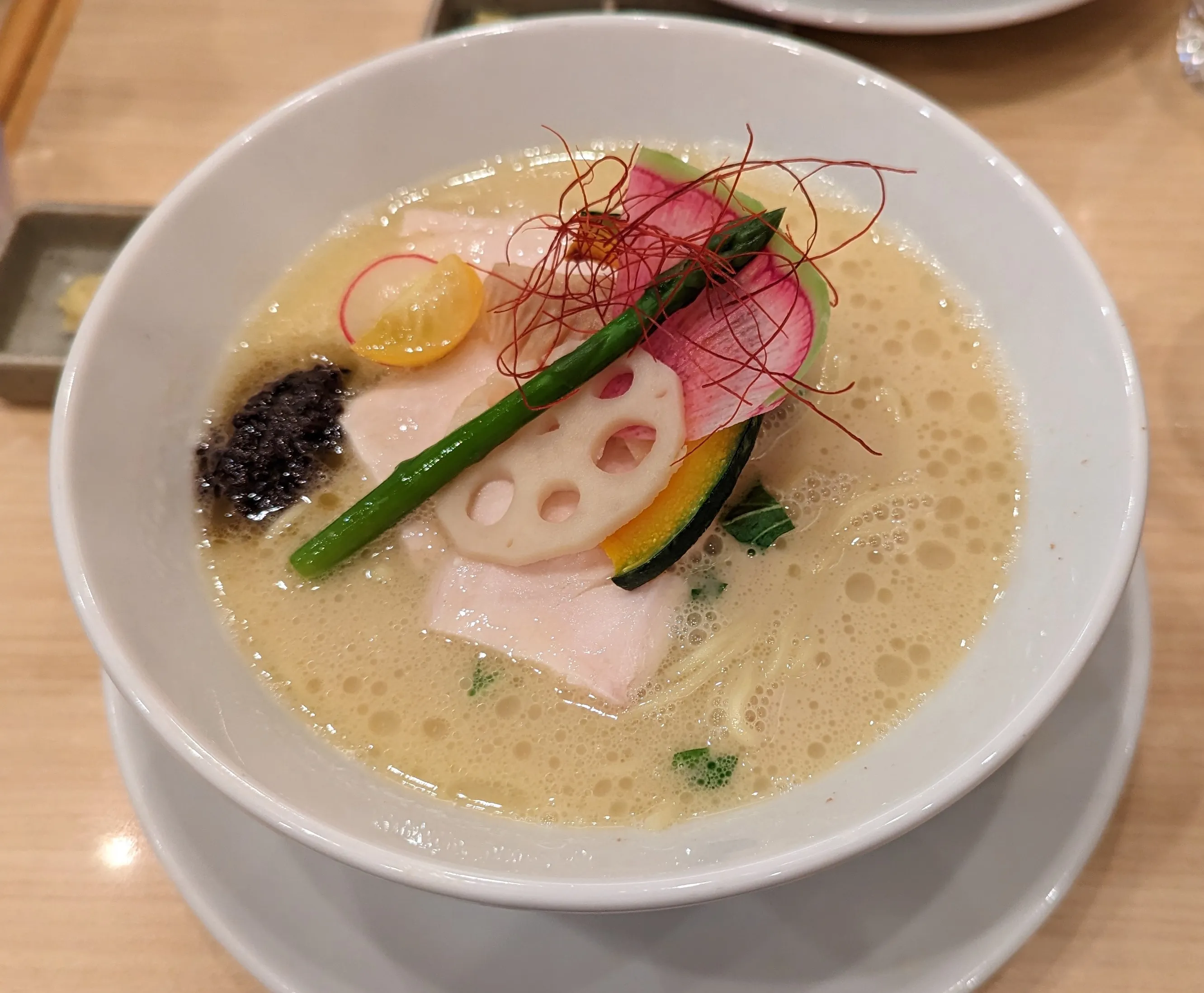 目の前に置かれただけでトリュフの香りが. 野菜はシャキシャキ,麺はスルスル,鶏肉はウマウマで最高だった. スープも濃厚で美味しくて全部飲み干しそうになった.(健康を考慮して8割ほどで我慢) 麺の上に載ってる野菜は季節?で変わるらしいのでまた行きたい.