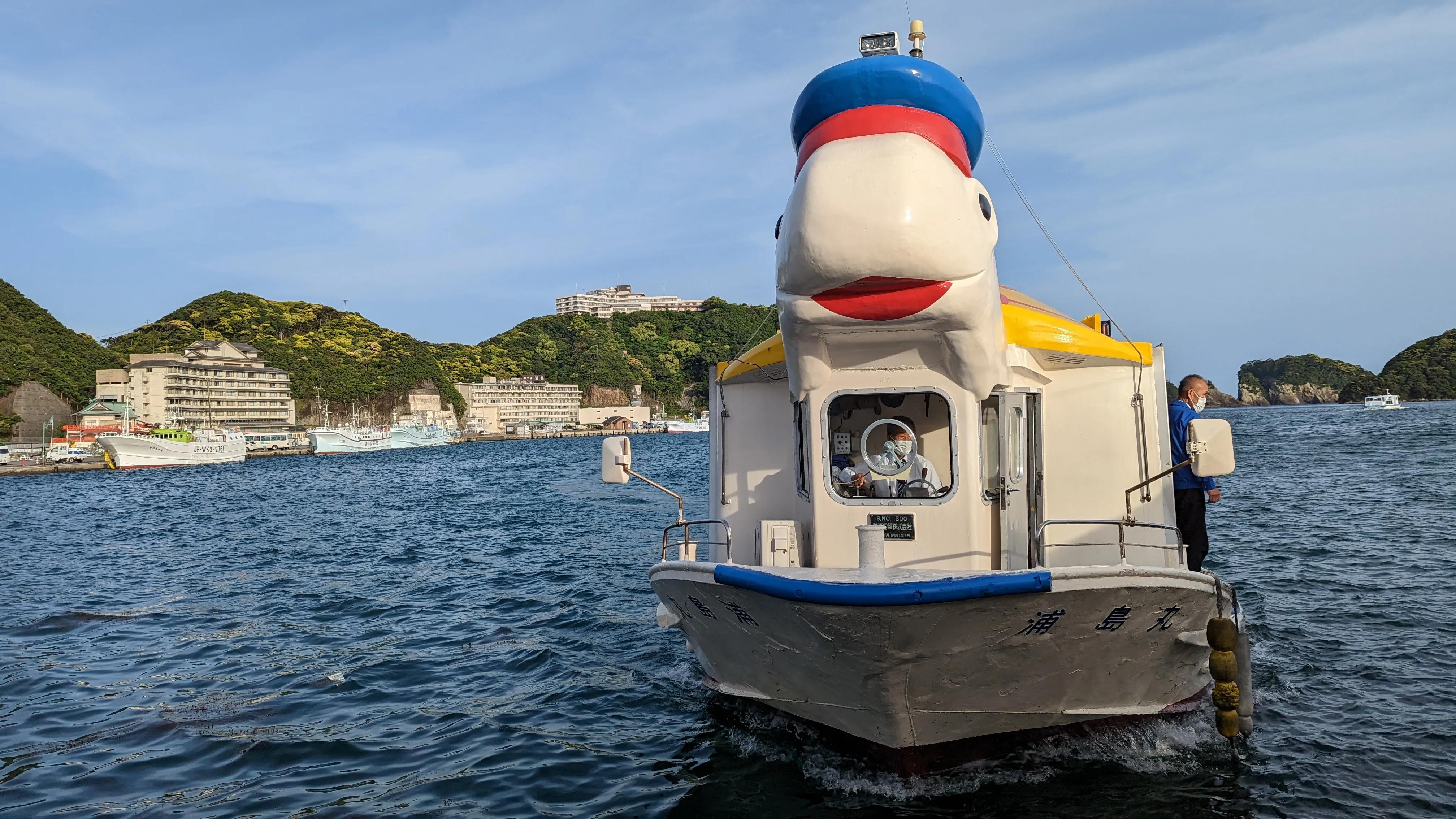 ホテル浦島は市街地から湾曲した岸をずっと行った先に位置しているので、船に乗って行くべきらしい。港で待っていると亀の船が来るのでこれに乗る。乗船料は無料で予約も不要。ありがたい。
