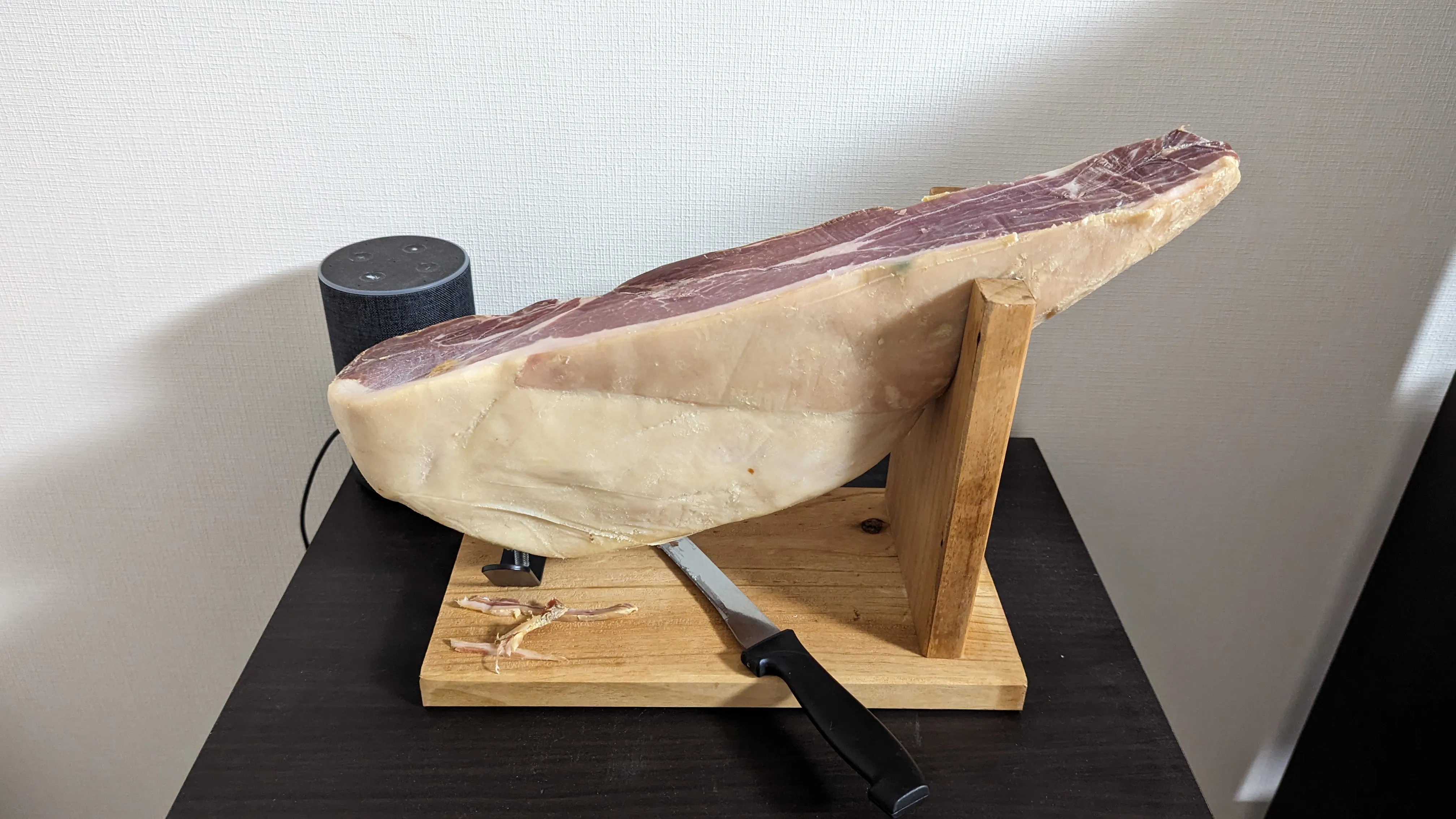 念願の生ハム原木設置完了。 薄く長く切るのが難しい。 思ったより臭いは気にならない。